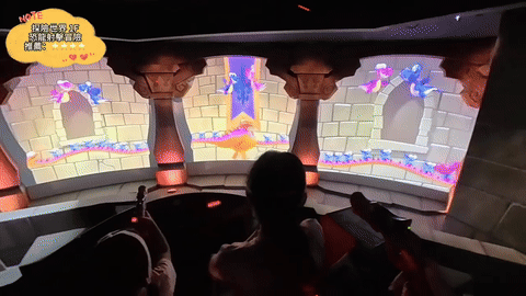 4D電影院場地很大,所以不太需要排隊。20分、40分、整點都有場次,所以我們玩完一次又去排下一次。