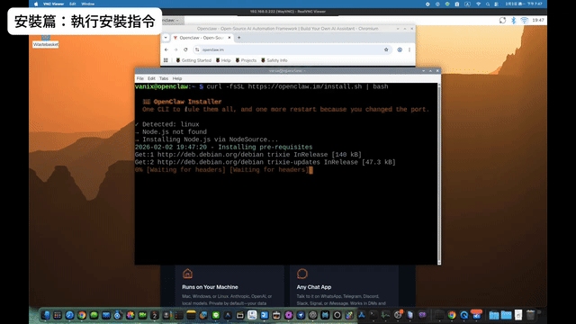 安裝過程簡單到令人驚訝。只需打開樹莓派的瀏覽器,進入 OpenClaw 官網,複製那一長串安裝指令,並在終端機貼上執行即可。